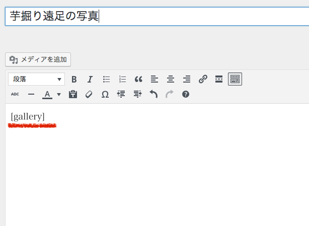 一番簡単な方法をご説明しますね。新しい投稿画面で写真をアップロードしておきます。全部アップしたら、記事投稿欄に たった一行、